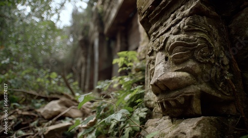 Ancient stone sculpture of a mythical beast face from a forgotten jungle ruin. Weathered carving with intricate details, sharp teeth, and green moss among wild foliage.