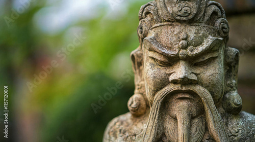 Ancient Stone Statue of Chinese Deity with Weathered Features and Rich Detail