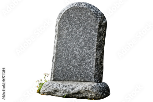 Ancient stone tablet with weathered texture isolated on transparent background. Simple grey headstone with rounded top crafted from smooth stone isolated on white background.