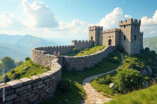 Ancient stone walls with watchtowers and battlements surrounding a sacred site, fortress, defensive