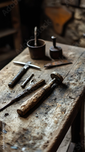 Ancient tools used for craftsmanship displayed on wooden table evoke nostalgia