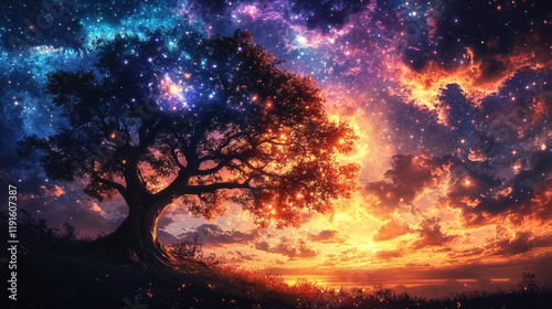 Ancient tree spreads its branches in front of a vibrant cosmic sky, nebula clouds and stars swirling above in a spiral, creating a mystical and abstract landscape with a blurred bright light tone