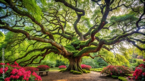 Ancient tree with gnarled branches and twisted trunk, surrounded by lush greenery and vibrant flowers, ancient, vines, flowers, blossoms
