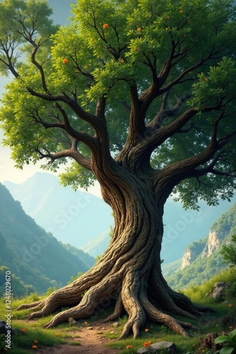 Ancient tree with gnarled trunk and twisted branches, wooden, ancient