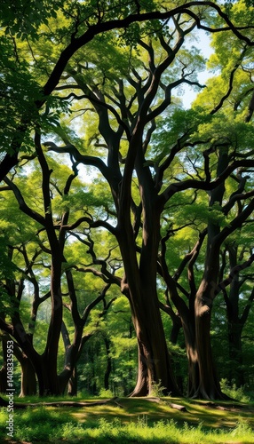Ancient trees form a dense, sun-dappled canopy in a lush, green forest, emerald, plant life, woodland