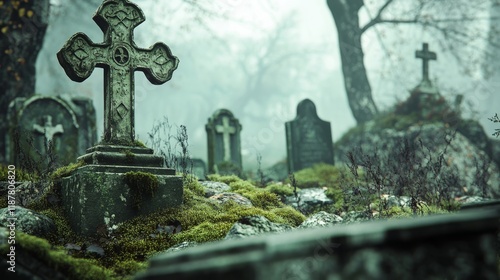 Ancient weathered gravestones arranged on mossy hill, tall marble crosses with ornate pedestals, scattered dry vegetation, gothic cemetery aesthetic, misty atmospheric lighting, monochromatic stone