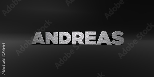 ANDREAS - hammered metal finish text on black studio - 3D rendered royalty free stock photo. This image can be used for an online website banner ad or a print postcard.