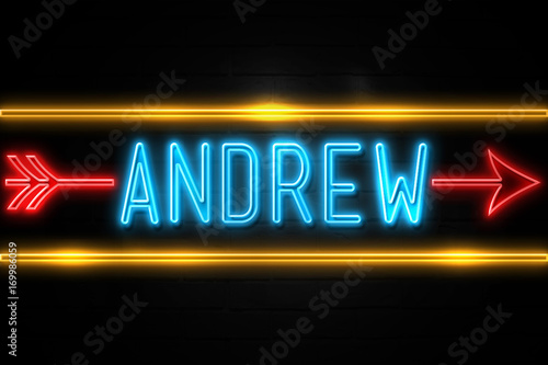Andrew - fluorescent Neon Sign on brickwall Front view