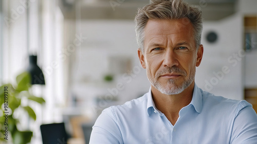 Angel investor with halo evaluating startup company pitch, smiling calmly in soft morning light, business success concept, business office background.