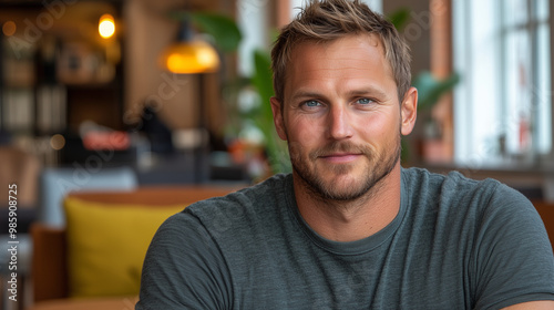 Angel investor with halo evaluating startup pitch, serene smile in soft morning light, entrepreneurial success concept
