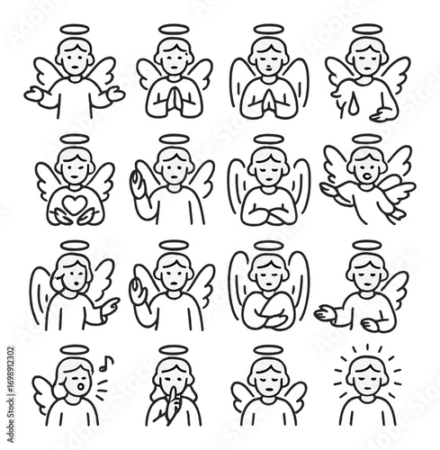 Angel linear icon set. featuring praying, singing, heart, peace, blessing, and meditating symbols