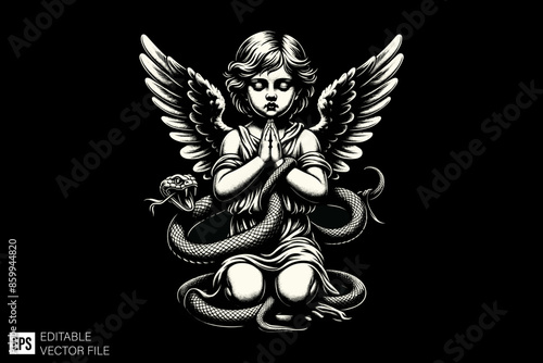 angels girls Praying black and white vector illustration