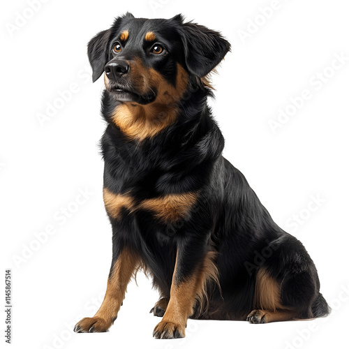Angled view full body shot of an extremely perfect looking single Bassador animal isolated on a white transparent background