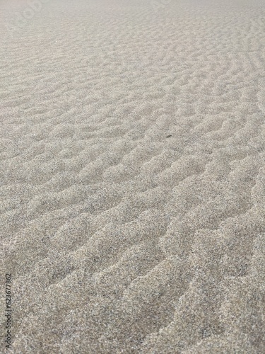 Angled view of beach sand with periodic pattern from the ebb and flow of water.