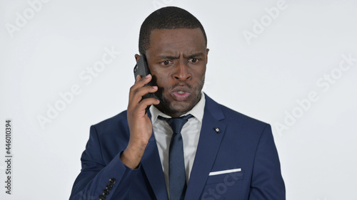 Angry African Businessman Talking on Smartphone, White Background
