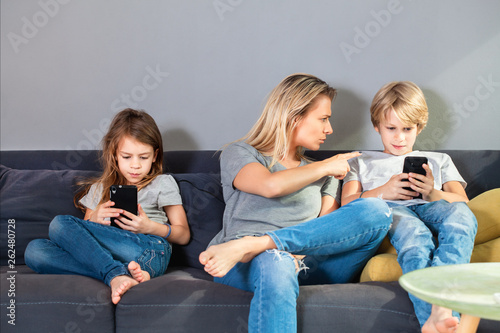 Angry and nervous mother scolding her smiling son while he is looking at smartphone. Family and modern technology addiction concept.