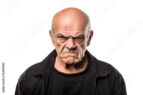 Angry belligerent senior man looking at the camera white background copy space
