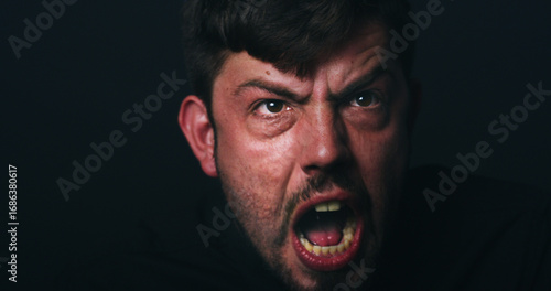 Angry, bipolar and man screaming in studio with schizophrenia, paranoid or panic reaction. Male person, shout and mental health crisis, split personality or rage with mockup space on black background