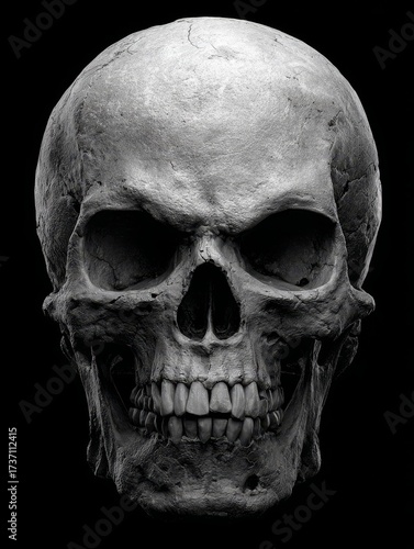 Angry black and white skull with menacing expression, detailed gothic style, dark horror concept, high contrast illustration, spooky Halloween or fantasy design for eerie atmosphere