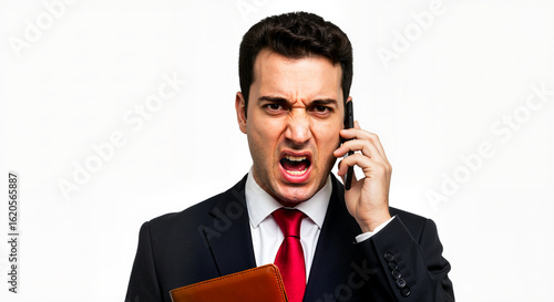 Angry Brazilian businessman shouting on the phone while holding a document isolated on a white background career