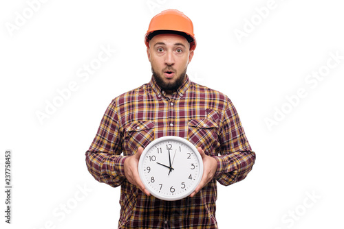 Angry Builder worker in protective construction orange helmet holding in hand a big alarm clock isolated on white background. Time to work. Building construction time.