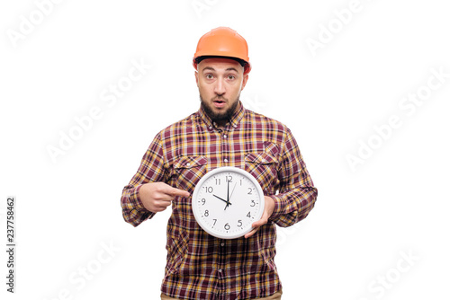 Angry Builder worker in protective construction orange helmet holding in hand a big alarm clock isolated on white background. Time to work. Building construction time.