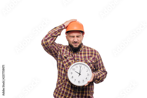 Angry Builder worker in protective construction orange helmet holding in hand a big alarm clock isolated on white background. Time to work. Building construction time.