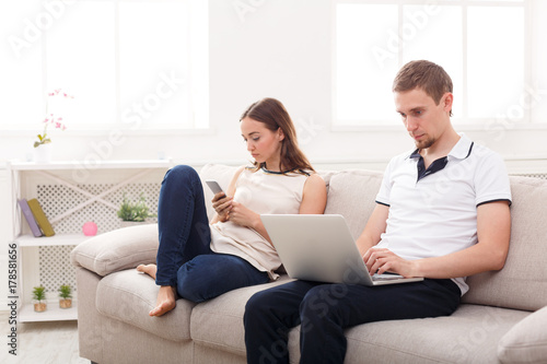 Angry couple quarreling and using gadgets irnoring each other