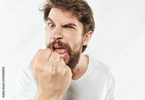 Angry man in a white t-shirt shows a fist gesturing with his hands to the model