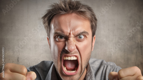 Angry man with disheveled hair, shouting with a furious expression, fists clenched, against a textured gray background, conveying intense emotion.