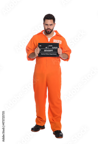 Angry prisoner with mugshot letter board on white background