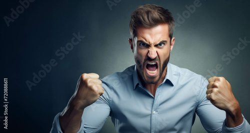 Angry young man screaming and clenching fists over dark background.