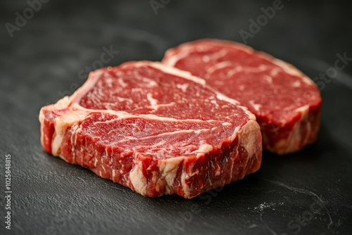 Angus ribeye steak, raw, showcasing rich marbling against a dark background, side lighting, ultra-high-definition