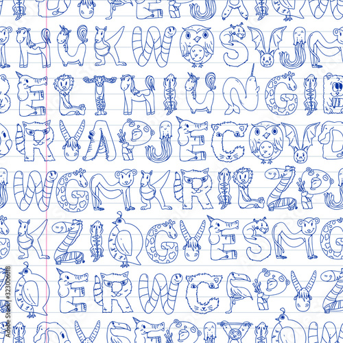 Animal alphabet. Zoo alphabet. Letters from A to Z. Cartoon cute animals. Elephant, dog, flamingo, giraffe, horse, alligator, bear, cat.