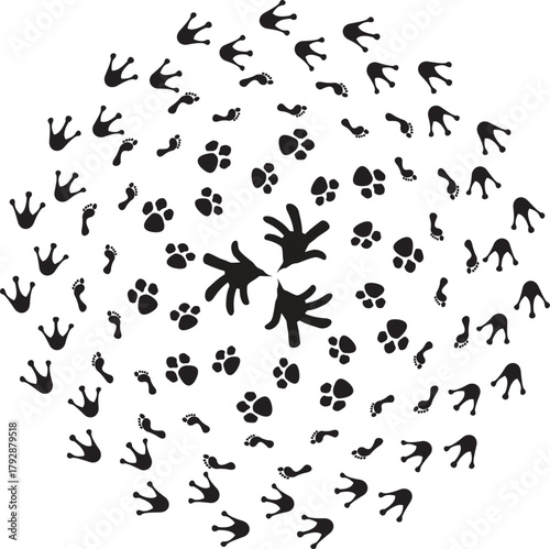 Animal Footprint Mandala – Pet Paw, Bird Track & Human Footprint Circular Pattern Vector Design