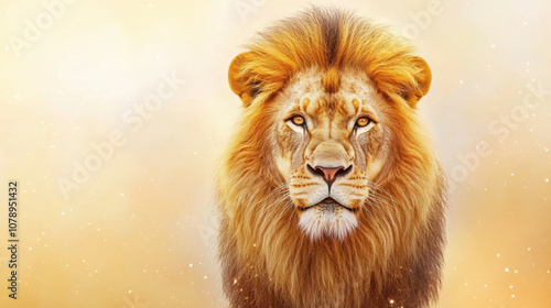 Animal front and look straight, Majestic lion with magnificent mane, gazing intensely at viewer, exuding strength and power in golden, ethereal background