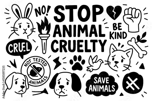 Animal rights and anti-cruelty symbols in bold hand-drawn style, Transparent Background