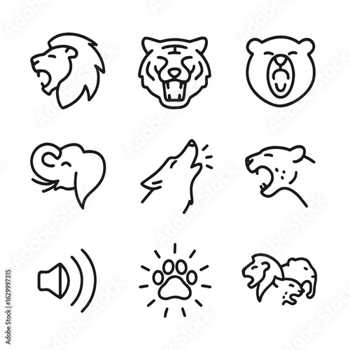 Animal Roar Icons. Outline icon set of roar in animals: lion, tiger, bear, elephant, wolf, cheetah, roar sound, animal call,