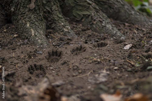 Animal tracks in soil near a tree, suggesting wildlife activity in the area.
