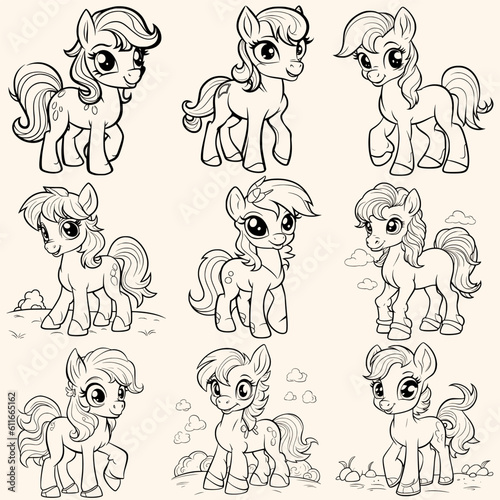 Animals collection set pack of pony coloring page for children.Сartoon style hand drawing vector illustration in black outline on a white background
