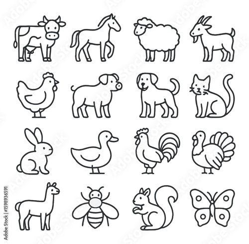 Animals linear icons set. includes cow, horse, sheep, goat, chicken, pig, dog, cat, rabbit, duck, rooster, turkey, llama, bee, squirrel, butterfly.