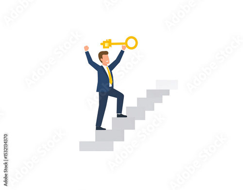 Animated Businessman Ascending Stairs Holding Golden Key in Triumph