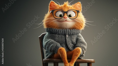 Animated cat in sweater, glasses, on chair, studio shot
