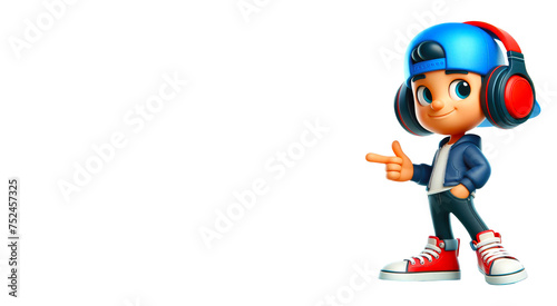 Animated character, a boy in modern, youthful clothes in bright colors on a white background, located on the right side of the image on a white background, space for text, AI, Generation