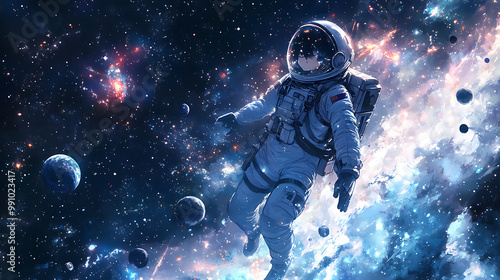 Anime girl in a space suit, floating among stars and planets in a galaxy