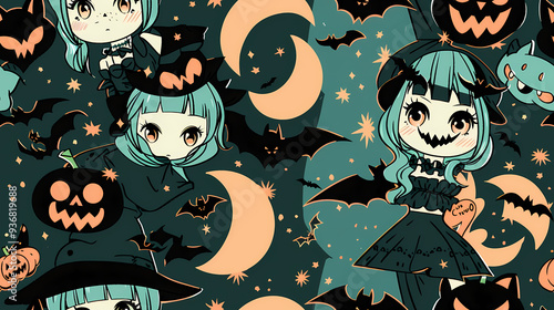 Anime Manga Halloween Witch Seamless Tile Pattern Design
