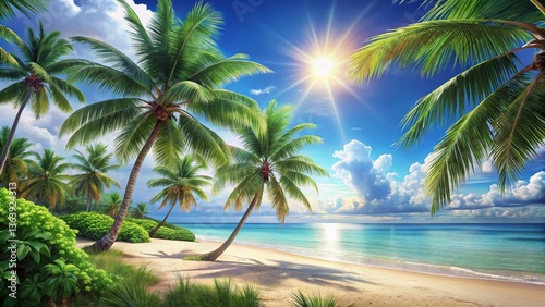Anime Summer Beach: Palm Trees & Ocean Serenity - Stock Photo