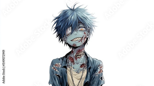 Anime zombie character portrait with blue hair and decaying flesh on white
