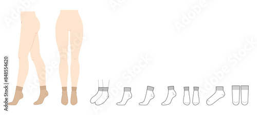 Ankle Socks set on women legs and CAD flat template mockup. Hosiery Fashion accessory clothing technical illustration stocking. Vector front, side view, sketch outline isolated on white background