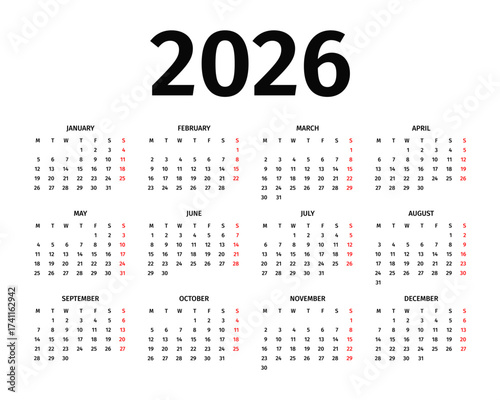 Annual calendar for 2026. Calendar template for 2026 in black and white colors. Annual 2026 calendar mockup on white background. The week starts on Monday. Vector